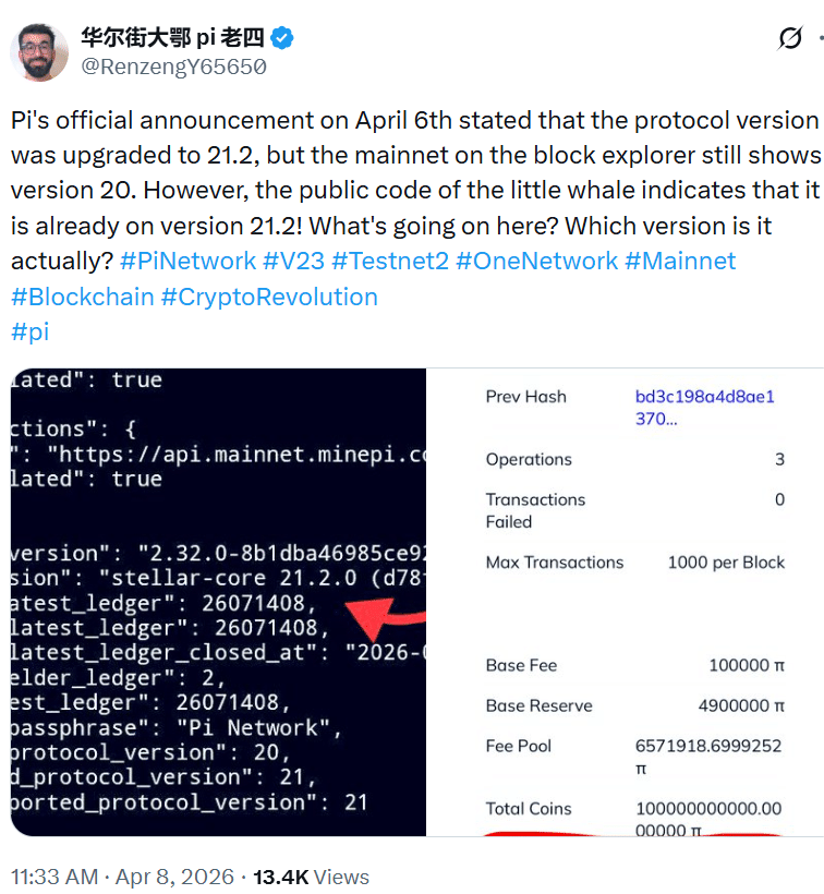 Pi Network于4月6日宣布将其主网协议从版本20升级至21.2,然而这一变更在公开区块链浏览器中尚未体现,系统仍显示为旧版本。该现象导致用户对网络状态与升级进度产生广泛疑问,凸显技术部署与对外呈现之间的脱节。