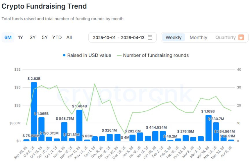 根据加密行业数据统计,4月第二周(4月6日至12日)共完成17轮融资,累计募资金额约为6691万美元。相较前一周(4月第一周,3月30日至4月5日)的19轮、2.645亿美元,本轮融资数量减少2笔,总额下降超过75%,资金流入趋势持续走弱。