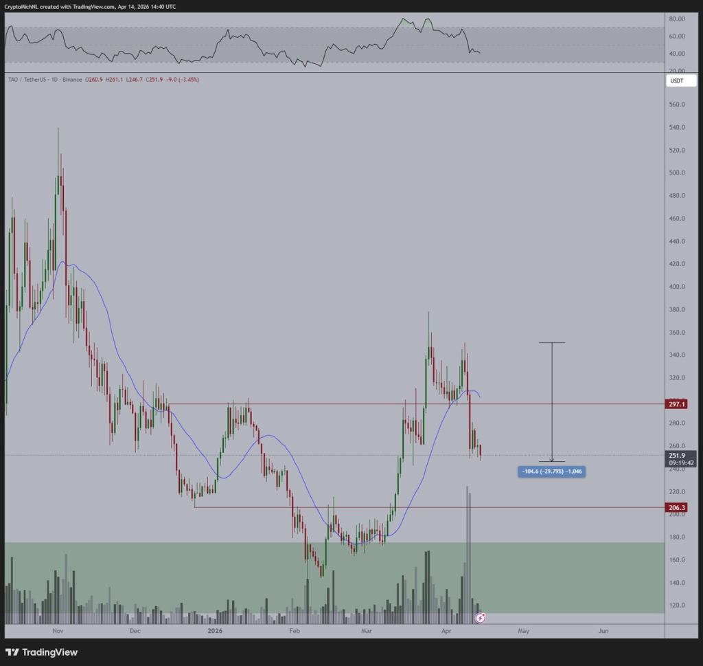 Michael van de Poppe发布的币安TAO/USDT日线图显示,价格曾在246.7美元触及低点,随后回升至251.9美元,相较297.1美元峰值回落约15%。
