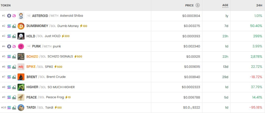 今日去中心化交易平台中,ASTEROID(WETH)、DUMBMONEY(SOL)及HOLD(SOL)成为最受市场瞩目的交易对。数据显示,ASTEROID(WETH)以0.0003113美元的价格位居榜首,24小时涨幅达1.30%;紧随其后的是DUMBMONEY(SOL),价格为0.003275美元,单日增长50.40%;第三名HOLD(SOL)则录得高达300%的惊人涨幅,当前报价为0.0001399美元。