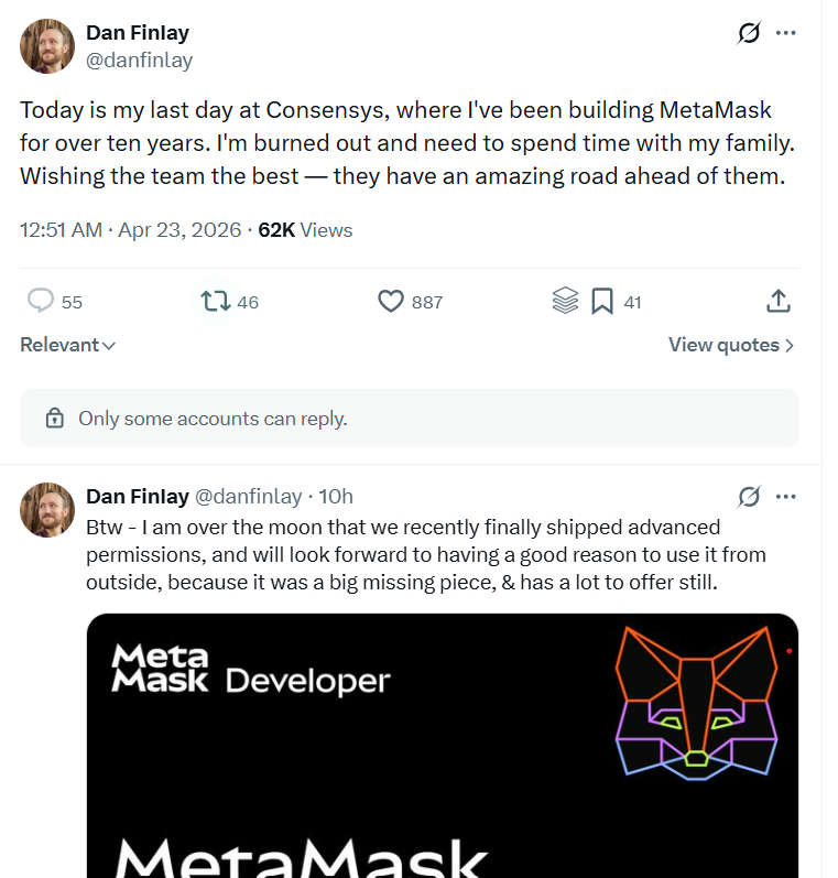 作为以太坊生态最具代表性的自托管钱包项目之一,MetaMask的联合创始人丹·芬莱在服务该平台十余年后,正式宣布将不再参与ConsenSys的日常运营。他透露,这一决定源于长期的职业疲劳,并希望重新聚焦个人生活与家庭时间。