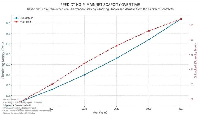 基于社区内部传播的预测数据,截至2031年,永久锁定的Pi代币占比有望从当前约60%提升至85%以上。即便网络应用活跃度持续扩张,实际可交易份额仍将持续收窄,形成结构性供给约束。