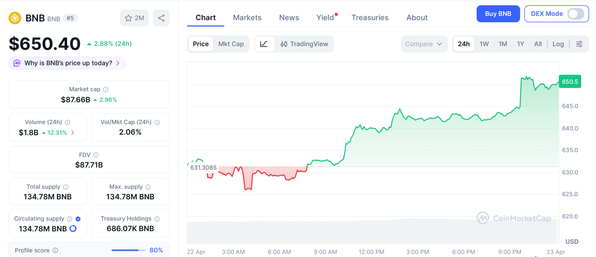 当前BNB报价为650美元,支撑位位于605美元,阻力区间为669美元。4月15日完成的第35次季度销毁移除了214万枚代币(约合13.2亿美元),自动销毁机制持续压缩流通总量,逼近1亿枚上限。根据CoinMarketCap数据,2026年第一季度BNB链日均活跃用户达450万,在主流Layer1网络中领先于波场与Solana。