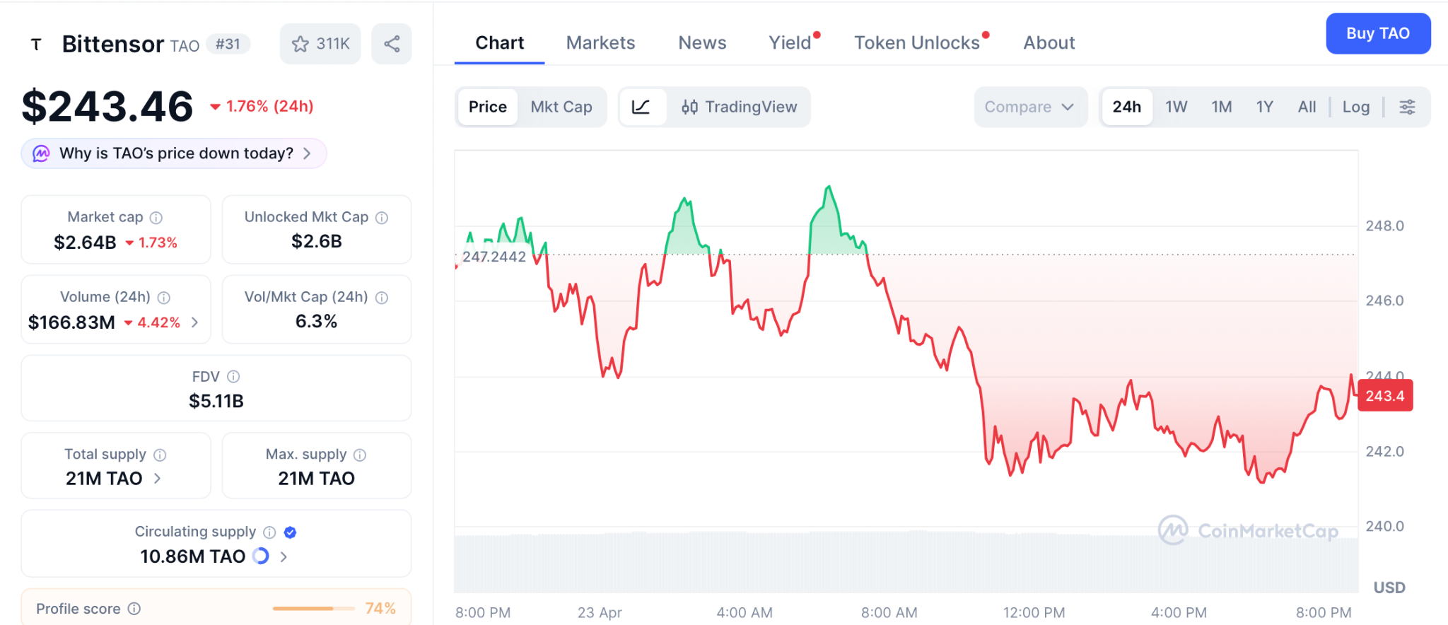 根据CoinMarketCap数据,Bittensor(TAO)当前报价243美元,其70%流通量处于质押锁定状态。伴随BitGo携手Yuma推出针对TAO子网代币的合规托管与质押服务,受监管资本首次获得直接接入路径,为价格预测注入结构性支撑。