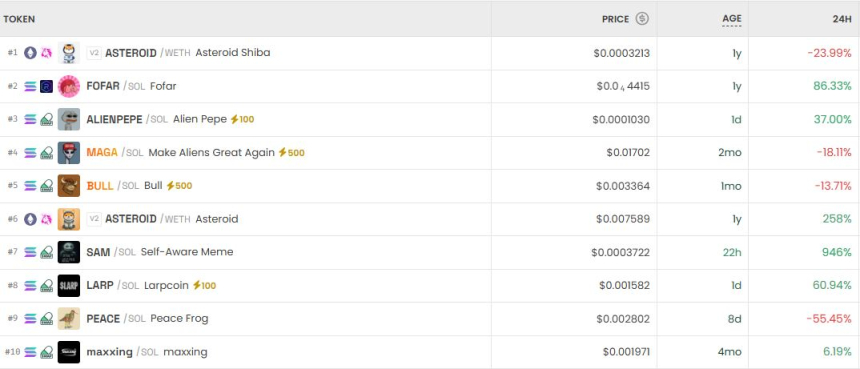 在涨幅排行榜上,AIB(AIB/WETH)以76,323%的惊人涨幅领跑,远超市场平均水平。紧随其后的是ASTEROID(ASTEROID/WETH),24小时增长270%;BURNIE(BURNIE/SOL)亦录得67.60%的上升空间。