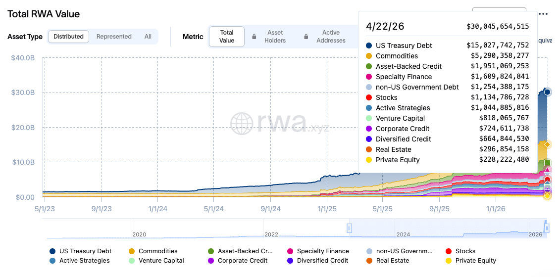 最新统计显示,全球代币化现实世界资产的总市值已攀升至300亿美元,较三年前实现20倍跃升,年复合增长率高达238%。这一迅猛扩张主要得益于金融机构对链上资产配置的深度采纳。
