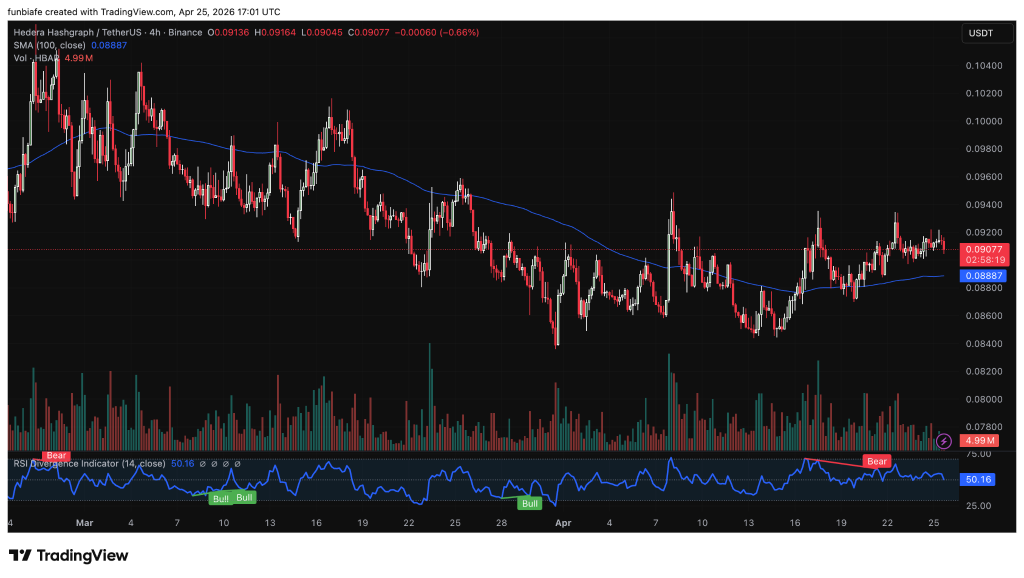 四小时图显示,HBAR当前报价为0.09077美元,日内下跌0.66%。价格已连续多周呈现下行通道,高点与低点逐级下移。下方关键支撑位依次为0.090美元、0.088美元与0.085美元;上方阻力位于0.092美元,随后是0.094美元与0.096美元。成交量仅为499万HBAR,表明市场尚未出现恐慌性抛售。相对强弱指数(RSI)接近45,处于中性偏空区间,价格正于近期区间的下沿整理。
