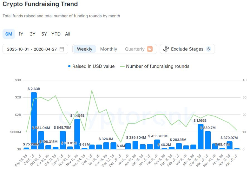 统计显示,4月20日至26日共完成11轮投资,累计募资约5198万美元。相较前一周的15轮、3.7097亿美元,投资轮次减少26.7%,资金规模缩水超98%,凸显资本端对高估值项目的审慎态度。