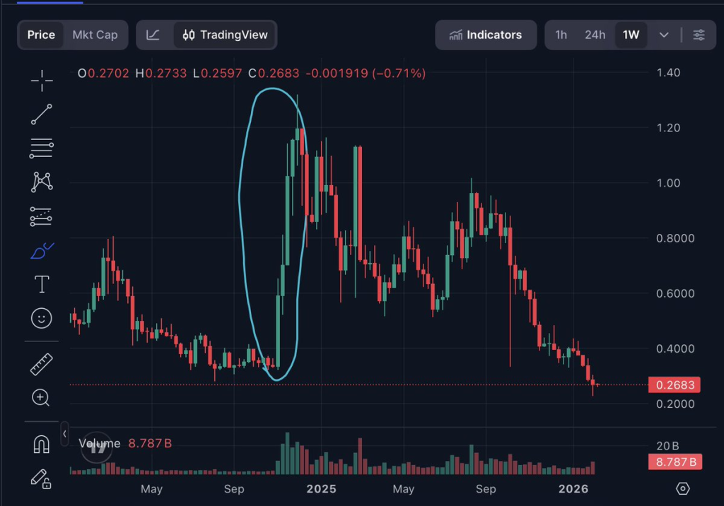 Mentor的论述构建了清晰的叙事逻辑:“该区域曾触发六倍涨幅,历史将重演”。这虽具吸引力,但实现月内六倍涨幅通常需要加密市场出现广泛的风险偏好浪潮、比特币流动性充沛、以及资金同步轮动至大盘替代币等多重条件。若无此背景,相同支撑位仍可能引发反弹,但后续动能往往较弱且走势混沌。