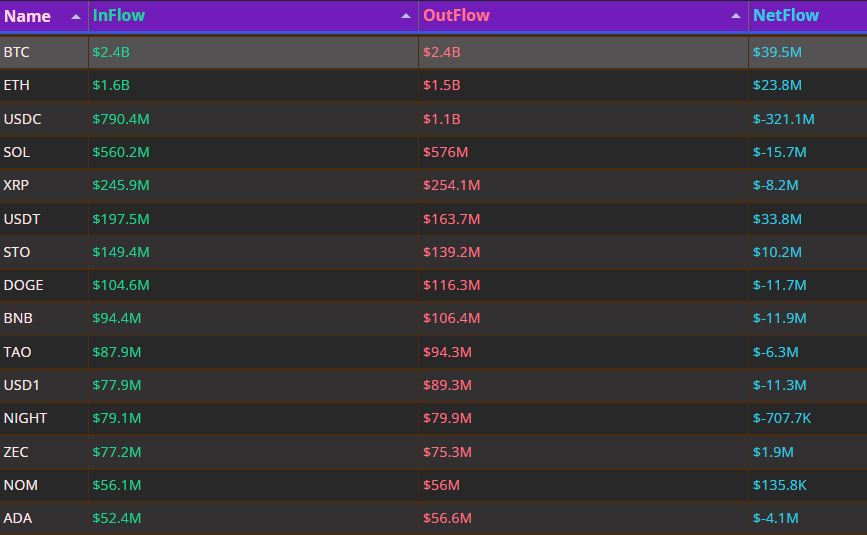 与此同时,资金外流压力集中在少数资产上,其中美元币(USD Coin)遭遇约3.211亿美元净流出,为最大资金撤离点。其余净流出项目包括Solana(1570万)、BNB(1190万)、狗狗币(1170万)及USD1(1130万),显示部分去中心化金融生态面临阶段性抛压。