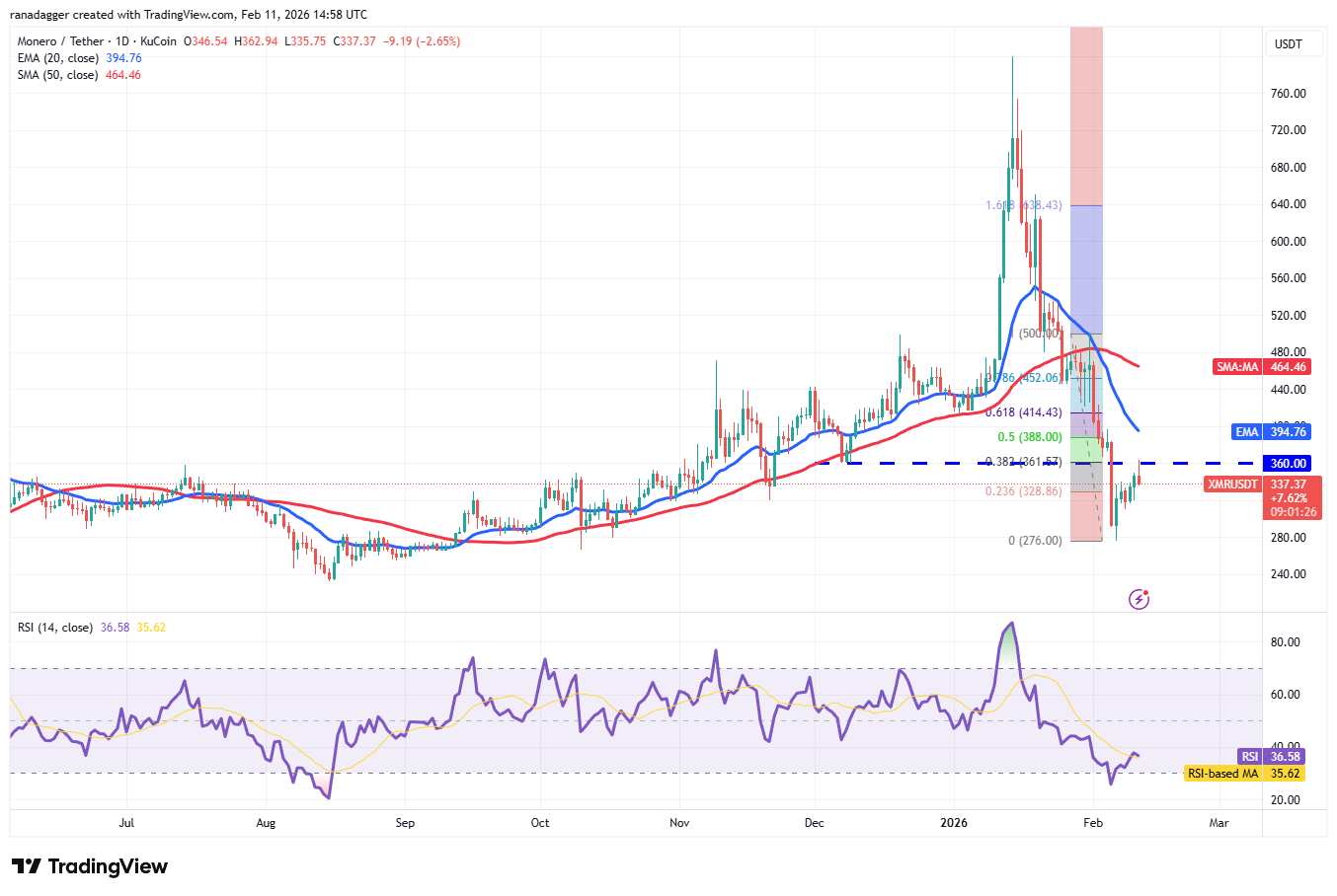 门罗币(XMR)触及361美元(斐波那契38.2%回撤位),空头在此位置正发起强劲挑战。