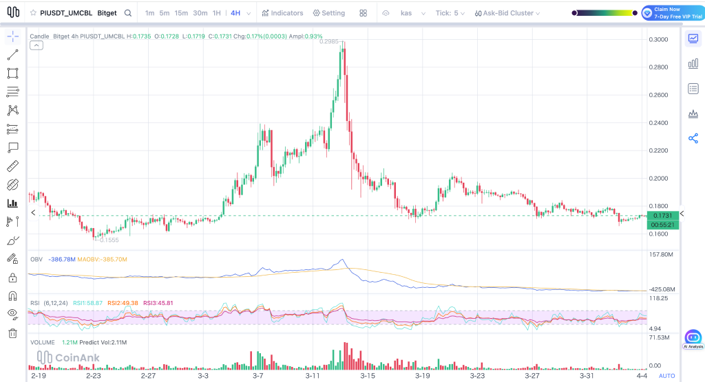 进入三月初以来,PI币价格上演过山车行情,从约0.17美元迅速跃升至接近0.30美元,一周内涨幅逼近92%。市场情绪随之高涨,交易量显著放大,大量投资者涌入,一度被视为突破历史高点的前兆。然而,市场快速反转,价格迅速回落至0.18美元区间,引发广泛质疑与不确定性。