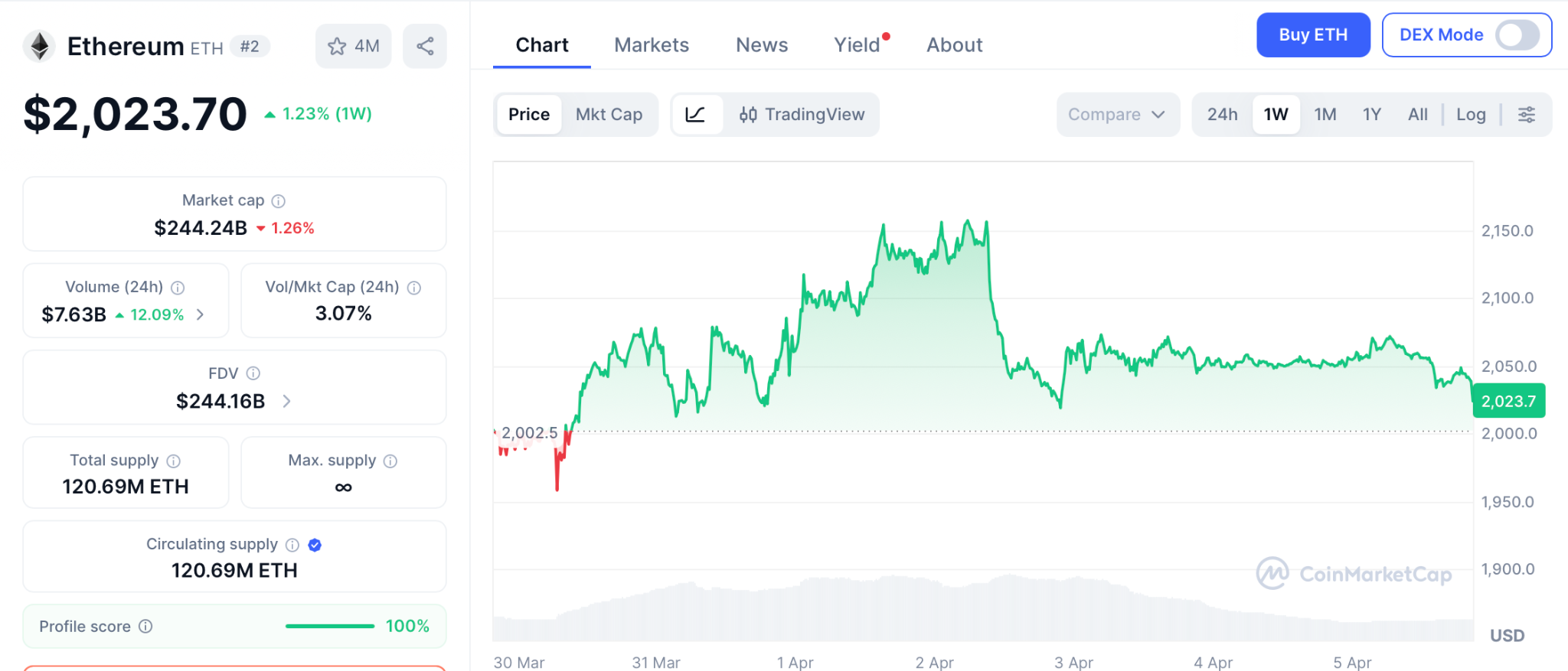 截至4月5日,以太坊报价约为2,034美元,较2025年高点4,953美元回落58%。但基金会的质押行动正逐步削弱下行动能。