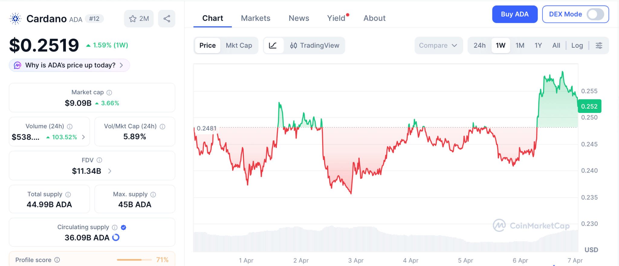 据CoinMarketCap数据,ADA现价为0.2519美元。协议第11版升级临近叠加资金流入回暖,被视作新一轮行情启动前兆。CoinCodex预测2026年中目标价达0.38美元,而Changelly则给出4月区间0.307至0.412美元的预期。