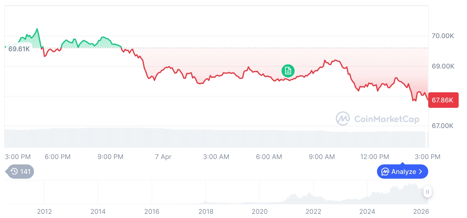 据TokenPost最新数据显示,当前比特币报价为67,856美元(约10.1582亿韩元),较前一日下跌2.57%。以太坊价格同步走低,跌幅达4.06%,现报2,069美元(约合3105万韩元),反映出投资者避险情绪升温。