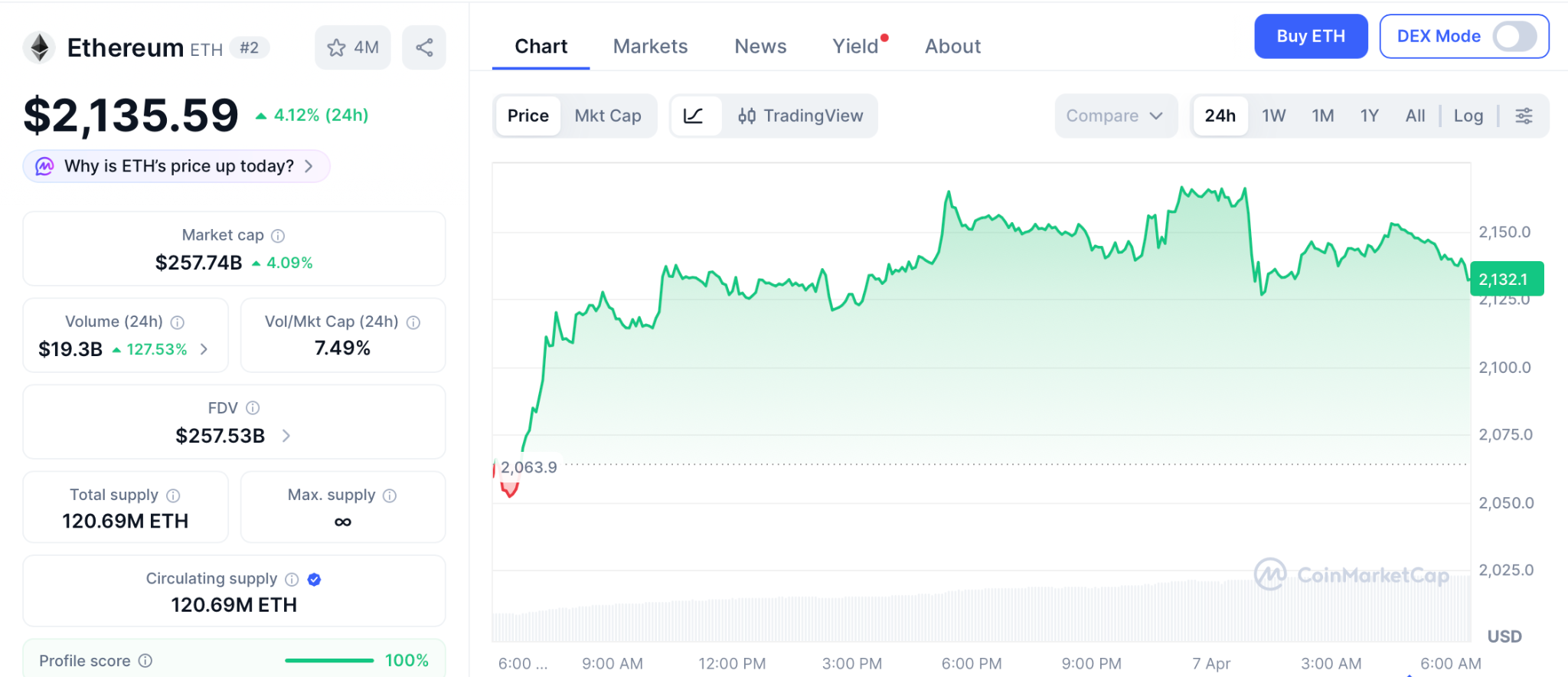 据CoinMarketCap数据,2026年4月7日ETH报价2,100美元,较历史峰值仍低57%。但Bitmine的大规模持仓表明机构对长期价值持坚定信念,市场或正处于缓慢修复阶段。