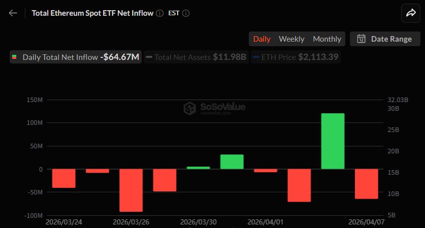根据最新数据,截至4月7日(当地时间),美国以太坊现货交易所交易基金市场录得6467万美元的单日净资金流出。这一变化标志着此前连续流入的势头被迅速逆转,前一交易日曾实现高达1.2024亿美元的资金净流入,表明市场短期动能出现明显调整。