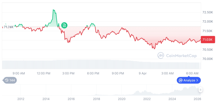 当前加密市场呈现明显整理格局,据TokenPost最新数据显示,比特币报价为71,009美元,较前一日下跌0.99%;以太坊价格报2,181美元,降幅达2.87%,市场情绪趋于谨慎。