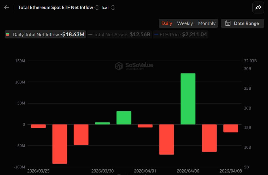 截至4月8日(当地时间),美国以太坊现货ETF市场录得1863万美元的单日资金净流出,标志着该市场已连续两个交易日呈现资金外流态势,短期调整趋势进一步显现。目前累计净流入总额为115.2亿美元,整体仍维持正向流入格局。