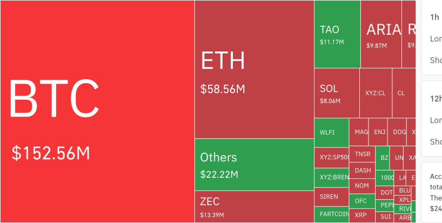 从币种维度看,比特币相关仓位是本次清算风暴的核心。24小时内,比特币相关头寸清算额达1.5256亿美元,其中4小时内的最大单时段清算额为6490万美元。