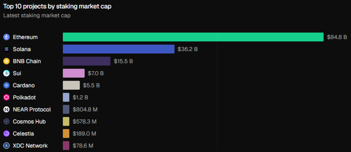 目前,其他主流公链在质押规模上与以太坊差距明显:索拉纳和币安链分别以362亿美元和155亿美元的质押市值位居第二、第三。