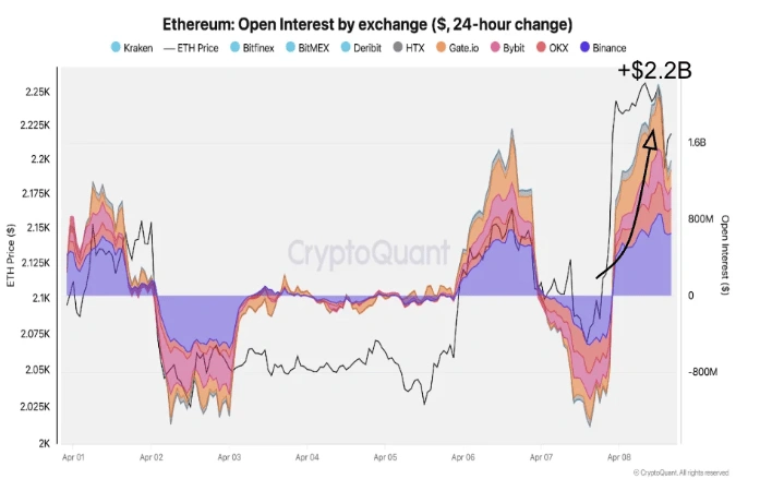 在美伊宣布停火后,以太坊单日涨幅达6%,为逾一个月来最强劲表现。同期未平仓合约飙升22亿美元,币本位合约同步上升,表明新增看涨头寸为主导动力,非空头强制平仓所致。主动买卖比率转强,凸显买方主导格局。