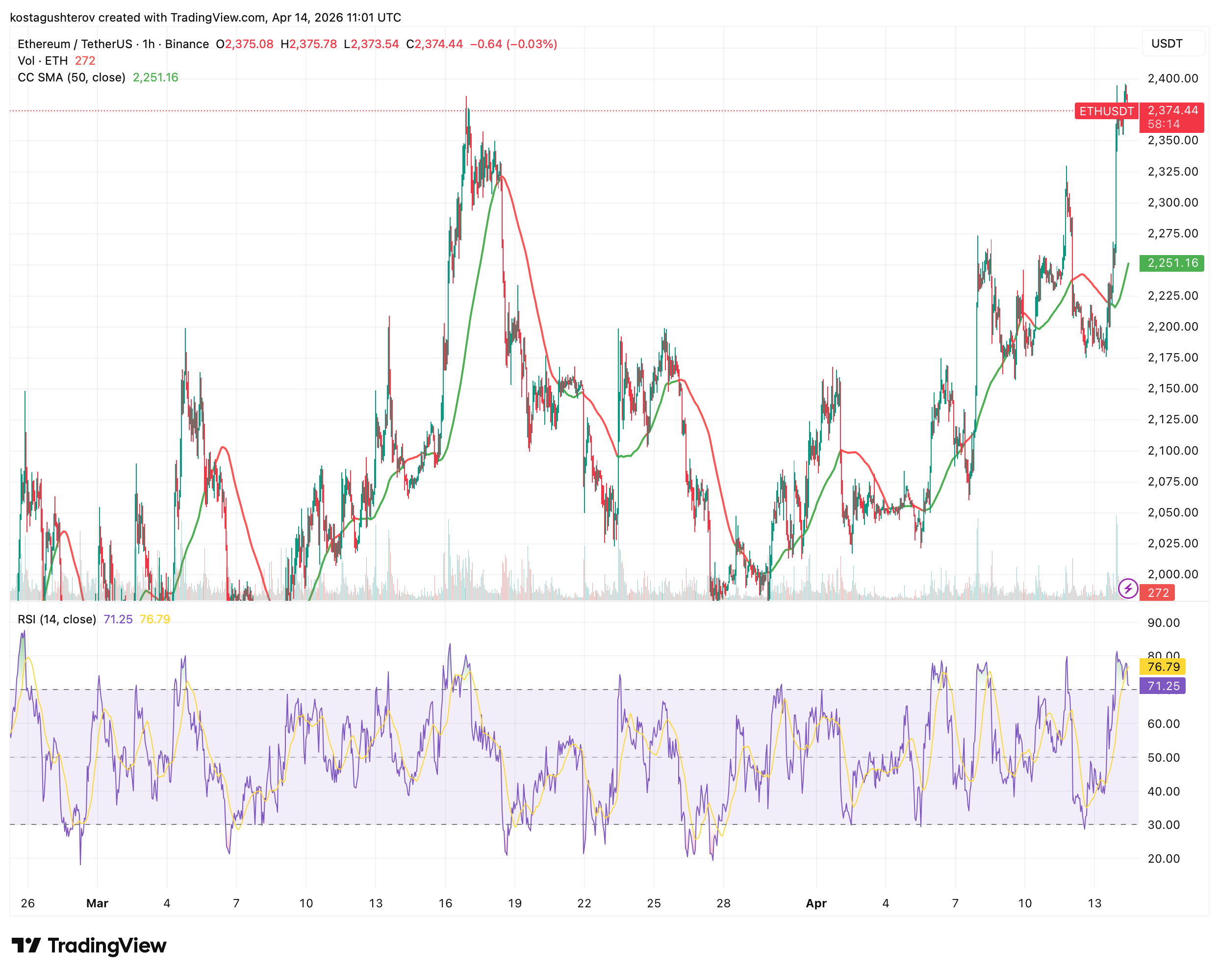 以太坊当前交易价为2374美元,较前一日上涨8.6%,已突破3月底及4月初两次确认的2000美元支撑位。50日简单移动平均线位于2251美元并呈上行趋势,当前价格高出均线123美元,形成自3月中旬以来首次明确的均线突破形态。