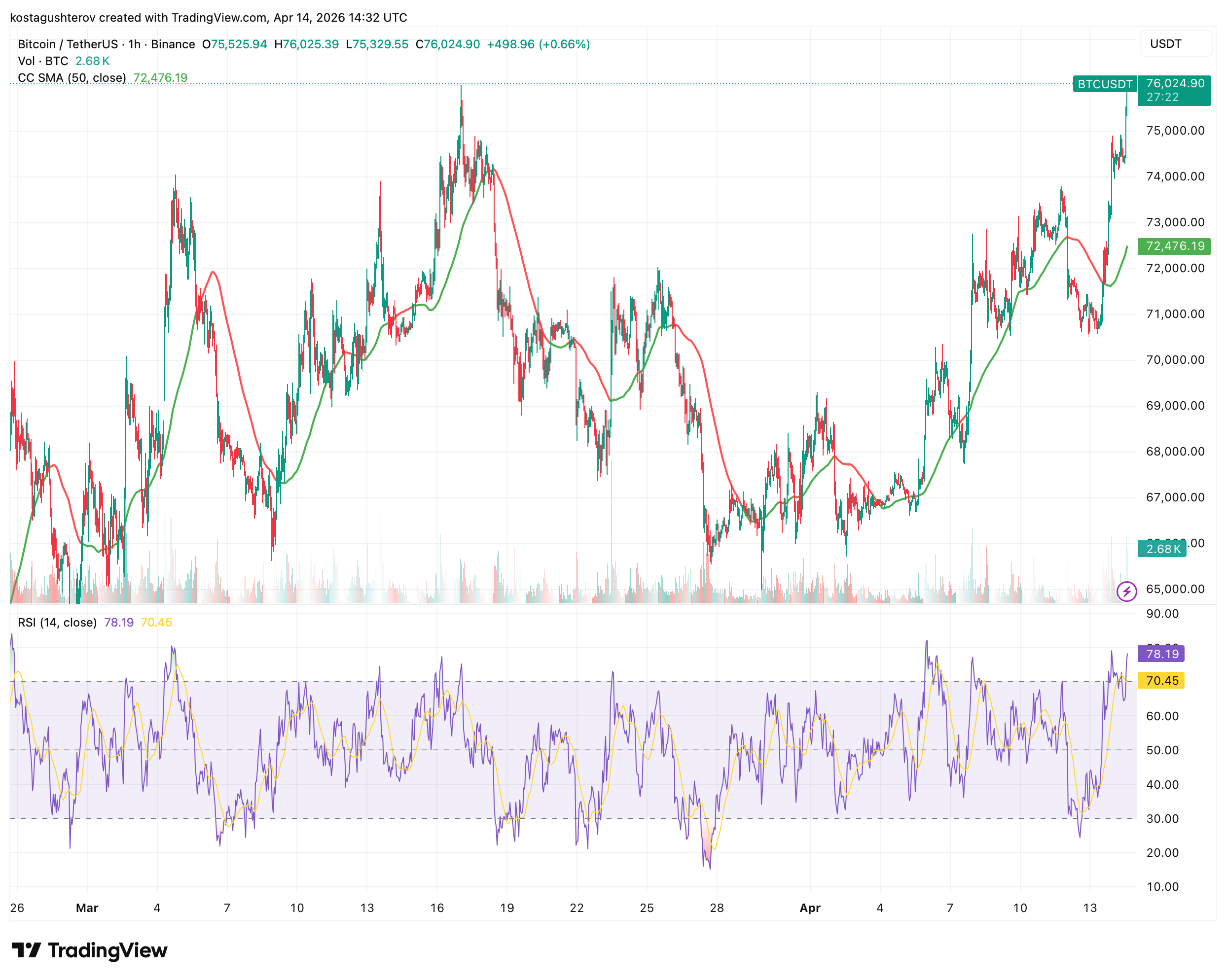 加密货币市场在4月14日迎来关键转折点,受多重外部因素影响,主要资产集体走强。比特币日内飙升至76,024美元,24小时涨幅达6.07%;以太坊则录得9.04%的强劲反弹,本周表现超越比特币,领先幅度扩大至16.46个百分点。