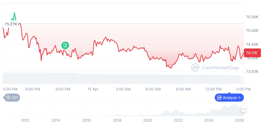 据TokenPost Market最新数据,截至4月16日凌晨12点4分(韩国标准时间),比特币报价为74,156.60美元,较前一日下跌1.11%;以太坊则报2,337.92美元,跌幅达0.81%,整体市场承压运行。