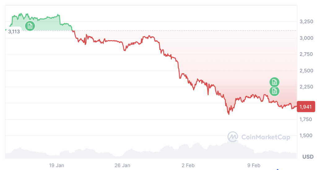 根据CoinMarketCap数据,截至发稿时以太坊交易价格为1,941美元,过去30天下跌41.65%。