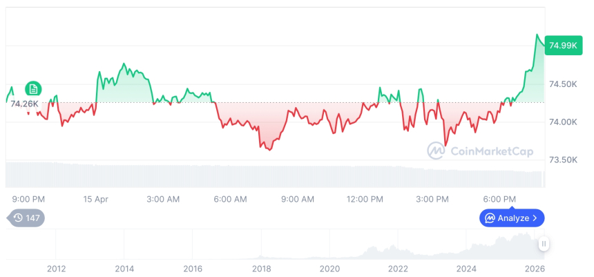 截至4月16日下午2时4分,比特币报价达75066.50美元,较前一交易日攀升1.08%;以太坊同步上扬至2376.30美元,涨幅为2.67%。多数主流山寨币同步走高,市场情绪趋于积极。