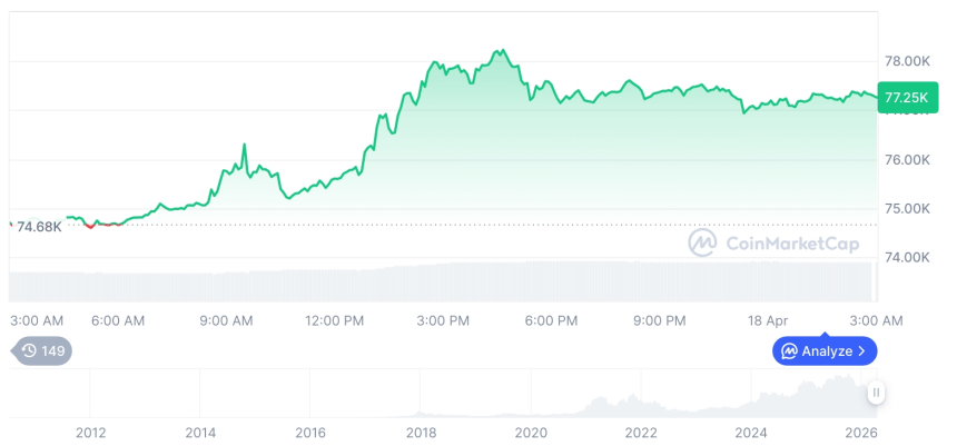 截至4月18日中午12时04分,比特币报77,311.18美元,较前一日上涨3.49%;以太坊价格达2,418.80美元,涨幅为3.73%。两大主流数字资产同步拉升,带动整个加密市场情绪回暖。