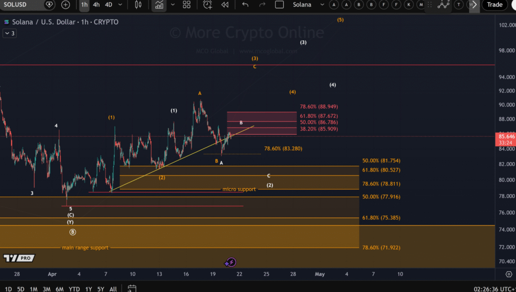 MCO Global DE分析团队指出,Solana已明确走完一轮完整的五浪下跌形态,此轮被定义为A浪调整。这一结构表明整体市场情绪仍偏向悲观,当前的价格回升更可能属于技术性修正,而非趋势反转的开端。