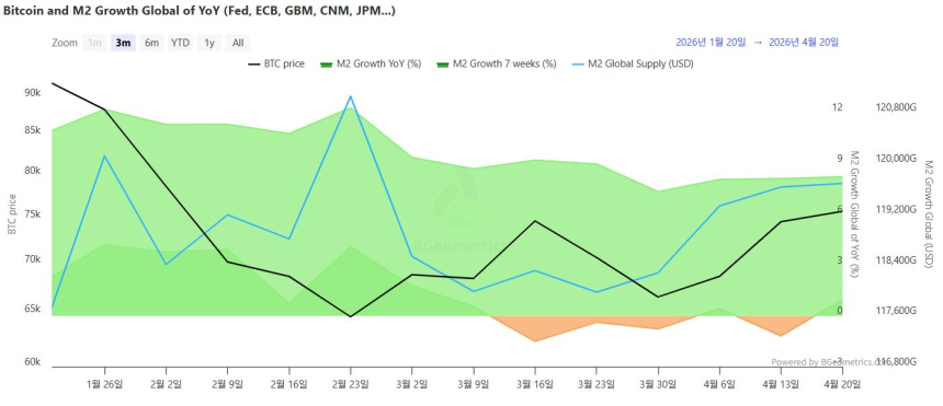 近期全球流动性增速出现积极转变,与比特币价格上行及交易所交易基金(ETF)资金持续流入形成共振。数据显示,截至4月20日,全球M2总量约为119.6818万亿美元,较前一周的119.6244万亿美元增长约0.05%,标志着短期流动性环境开始修复。