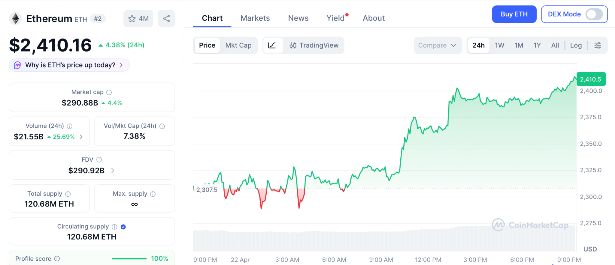 4月22日,以太坊价格表现强劲,收于2,410美元,24小时涨幅达4.38%。市场关注焦点转向机构行为——Bitmine Immersion Technologies披露其以太坊储备已达498万枚,总价值约115亿美元。仅在上周,该公司便增持101,627枚代币,创下自2026年以来最密集的单周买入记录。