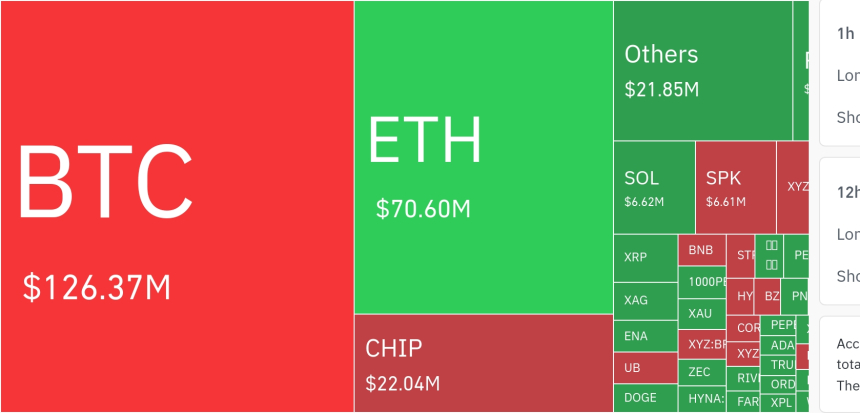 在最近24小时内,全球加密货币市场累计触发约2.4741亿美元的杠杆仓位强制清算。从清算分布看,比特币贡献了1.2637亿美元,以太坊达7060万美元,合计占总量近八成,凸显当前市场调整仍围绕核心资产展开。其余如CHIP、SOL、SPK等币种亦出现显著清算压力,分别达到2204万、662万及661万美元。