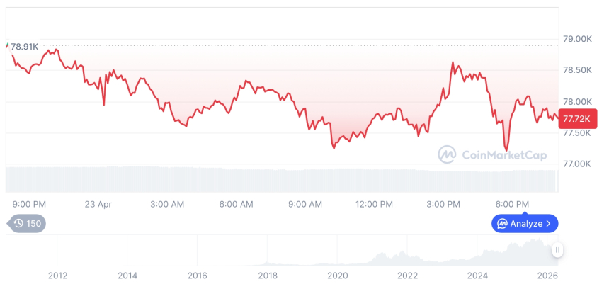 截至4月24日上午,比特币价格约为77,805.12美元,较前一日下跌1.47%;以太坊报2,319.53美元,跌幅达3.35%。主要竞争币普遍承压,整体市场表现疲软。