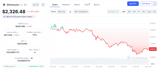 根据CoinMarketCap数据,以太坊当前报价为2,326美元,在伊朗停火延长引发市场反弹后,于4月23日回调3.42%。尽管短期波动显现,但Bitmine持有量已达497万枚,正逐步逼近其设定的5%持仓目标。同时,以太坊市值从2330亿美元迈向3000亿美元,预示未来数月约25%的增长空间。