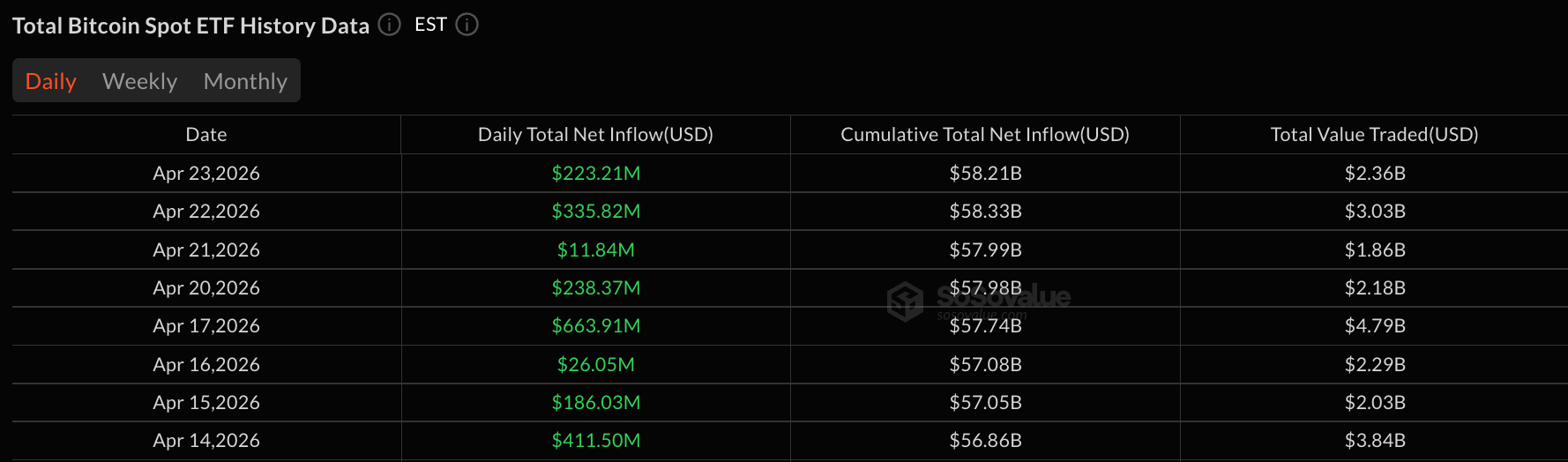 比特币现货交易所交易基金在4月23日录得2.23亿美元净流入,延续连续八个交易日的资金净流入纪录。其中,贝莱德的IBIT产品贡献1.6749亿美元,ARK & 21Shares的ARKB流入7,122万美元。目前,比特币相关ETF总资产规模已达1,027.9亿美元。