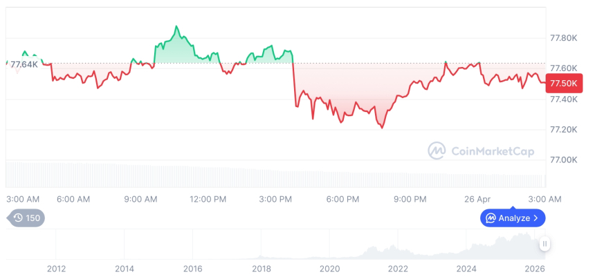 加密货币市场呈现波动调整格局。据TokenPost Market数据,截至4月26日中午12点4分(韩国标准时间),比特币报价为77,508美元(约合1,144万韩元),较前一日微跌0.15%;以太坊价格报2,315美元(约合342万韩元),跌幅为0.13%。整体市场情绪偏谨慎,多类山寨币表现出现明显分化。