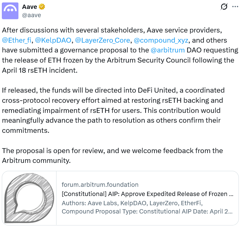 Aave Labs正式提交提案,建议由Arbitrum去中心化治理机构释放与Kelp DAO漏洞事件相关的30,765枚以太币,总额约7350万美元,并将其定向划拨至名为“DeFi United”的专项基金,用以恢复rsETH代币的流动性锚定并补偿受影响持有者。