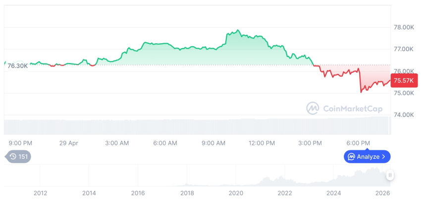 当前加密货币整体呈现下行态势,据TokenPost市场数据,比特币报价为75,491.84美元(约合1.116亿韩元),较前一交易日下滑1.13%;以太坊则报2,233.03美元(约合330万韩元),跌幅达3.09%。